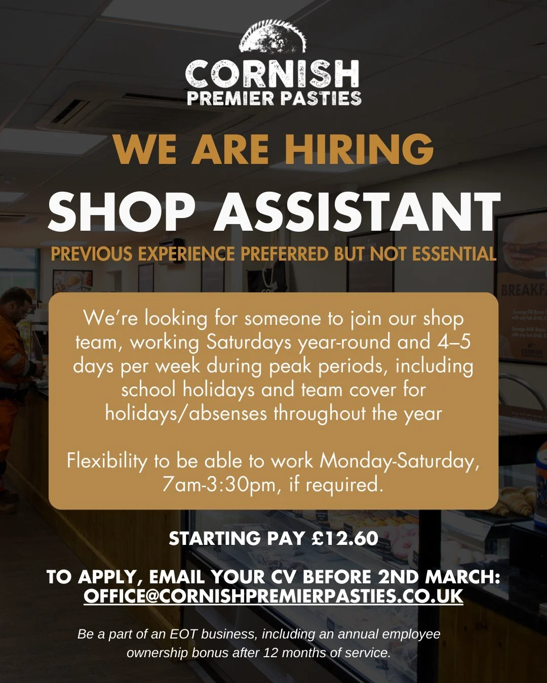 To apply, email your cv before 2nd march: office@cornishpremierpasties.co.uk